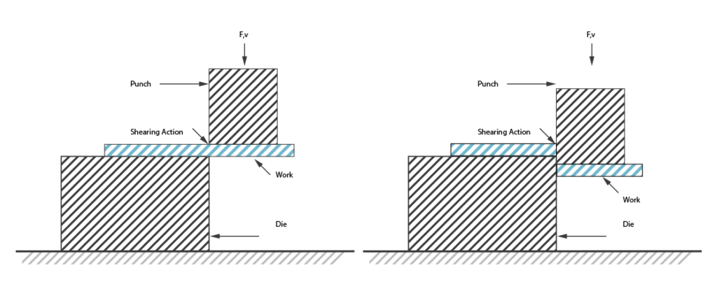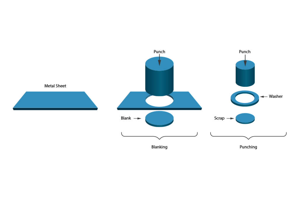 O processo de puncionamento consiste em encaixar uma folha de metal entre um punção e uma matriz, que são montadas dentro de uma prensa. Tanto o punção quanto o molde têm o mesmo formato, embora variem incrementalmente em tamanho, de modo que, quando o punção é pressionado no molde, um orifício ou depressão é criado na chapa metálica.