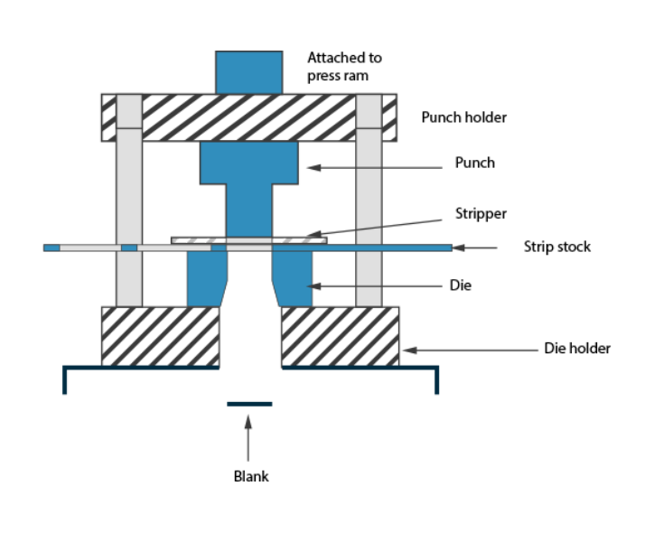 No processo de estampagem, uma peça de estoque de folha de metal é colocada em uma prensa de estampagem que transforma o metal na forma desejada usando matrizes macho e fêmea.