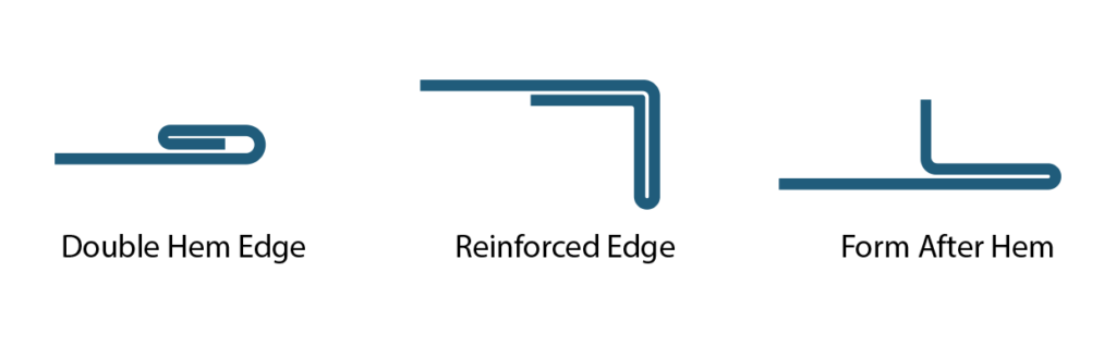 Como os cachos, as bainhas são integradas às peças de chapa metálica para tornar as bordas das peças seguras para o manuseio. Existem vários tipos de bainhas, incluindo bainhas abertas, planas e rasgadas. Ao contrário dos cachos, que não têm borda áspera, as bainhas ainda têm bordas expostas. Para bainhas abertas, o diâmetro interno deve ser pelo menos tão grande quanto a espessura do material, enquanto o comprimento da bainha deve ser pelo menos quatro vezes a espessura do metal. Para bainhas de lágrima, as mesmas medidas se aplicam, bem como uma abertura de pelo menos um quarto da espessura.
