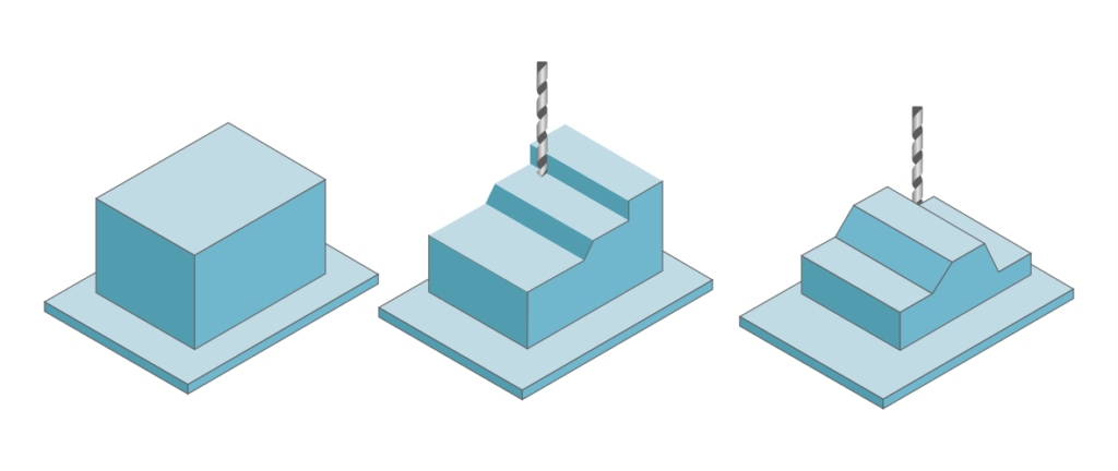 Para tornar o processo de fresamento CNC o mais eficiente possível, o material inicial a ser removido é cortado por ferramentas maiores a uma taxa de RPM mais alta. Isso permite a remoção rápida da maior parte do material. Quando a peça está quase pronta, ferramentas de maior precisão com menos RPM chegam para finalizar a peça.